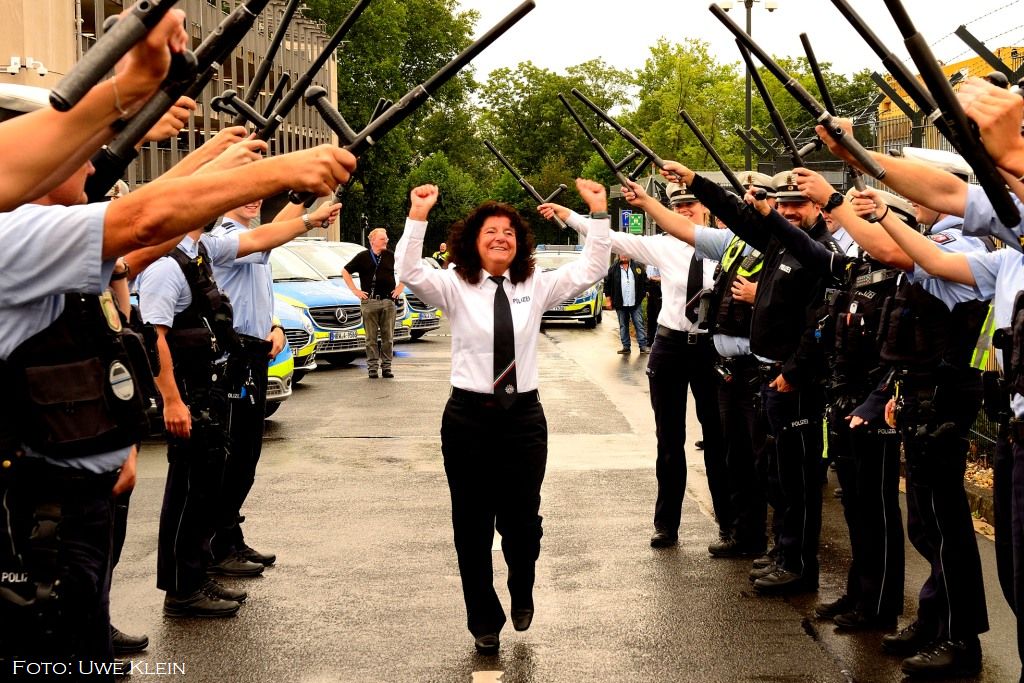 Jetzt diente er aber noch einem ganz anderen Zweck. Einem schönen. Kolleginnen und Kollegen der Polizeiinspektion Süd nutzen ihn als Spalier. Spalier für Susanne Skorzik, Leiterin der Hauptwache der Polizeiinspektion 2 - Süd, die in Pension geht. Durch diesen EMS-Tunnel musste sie durch. Zunächst verabschiedete sie sich bei den Kolleginnen und Kollegen in der PI 4 (Mülheim) und dann von denen an der Liegenschaft der Theodor-Althoff-Straße, ihrem letzten Arbeitsplatz.